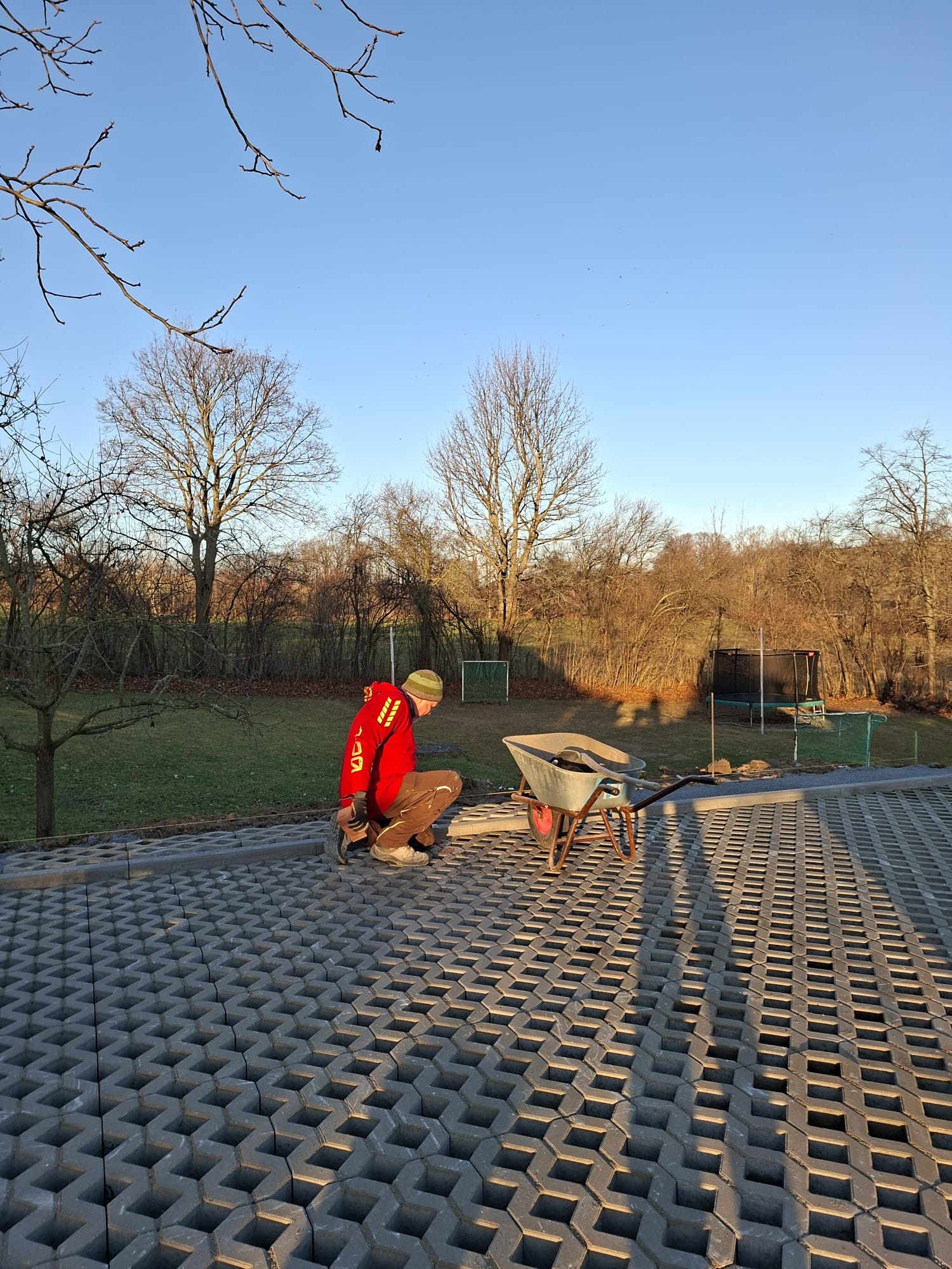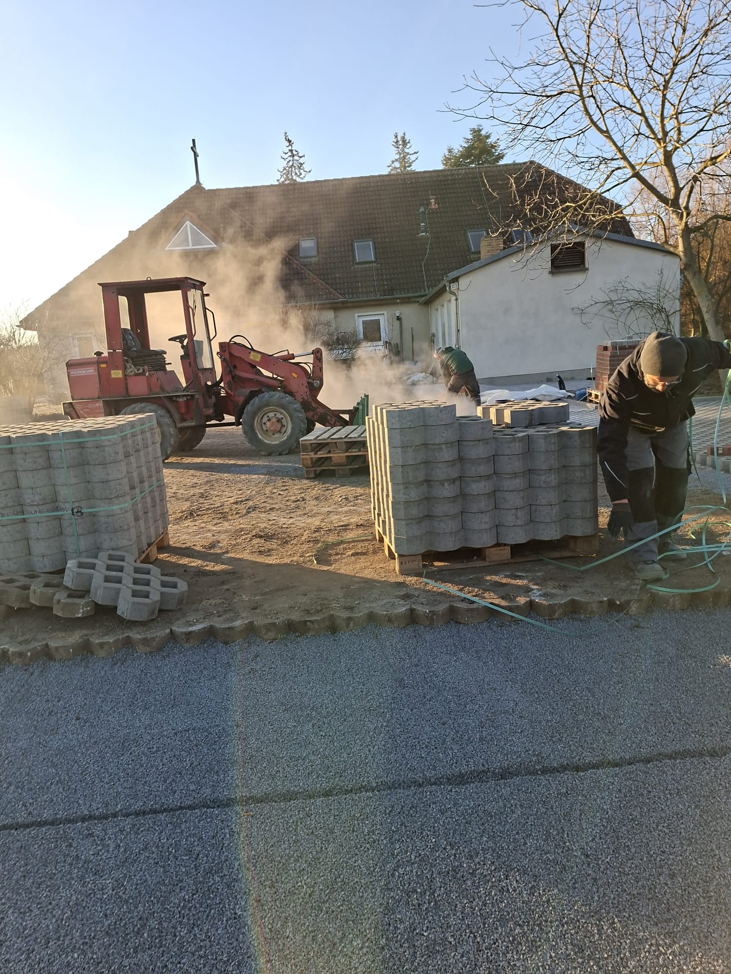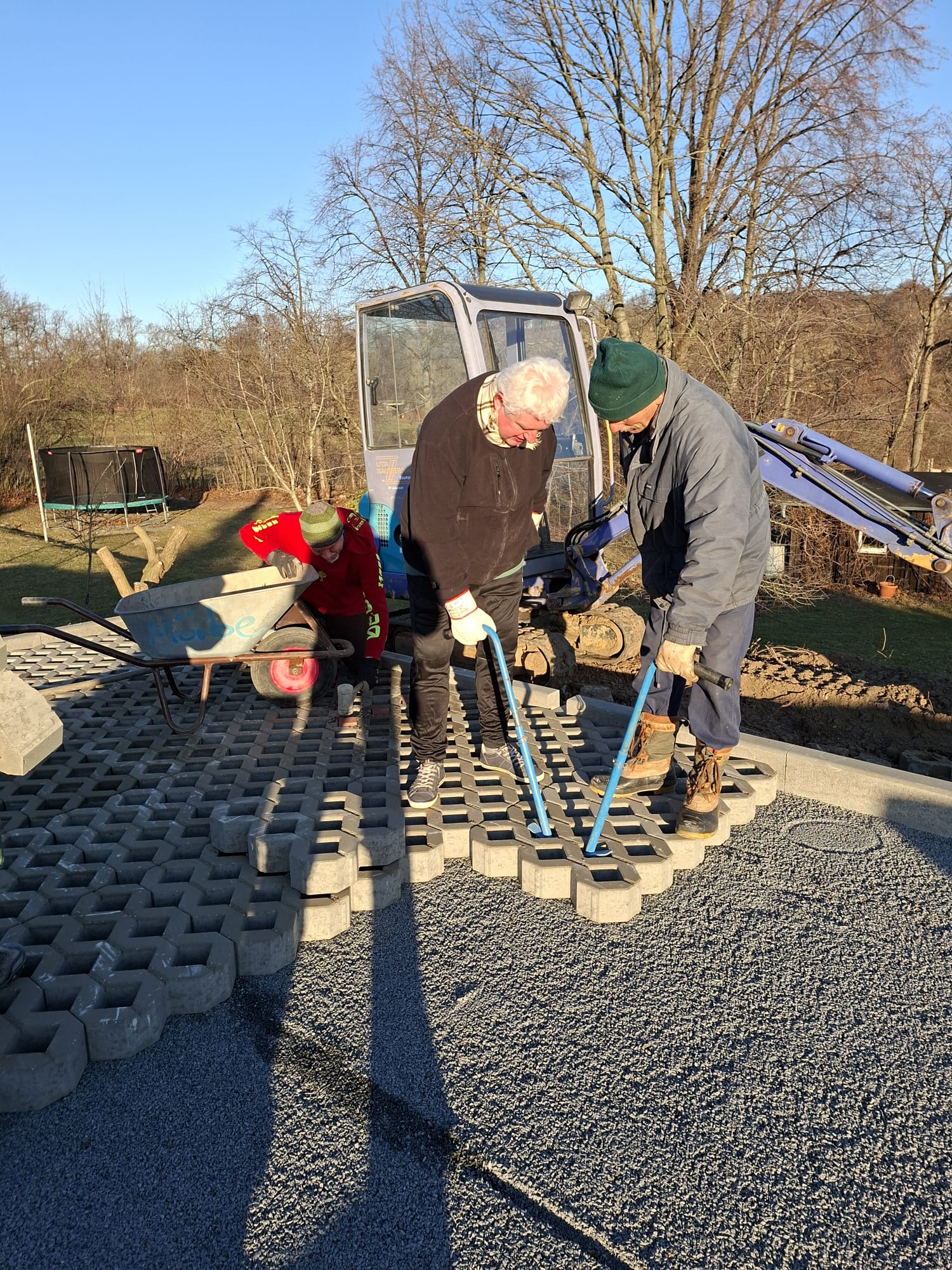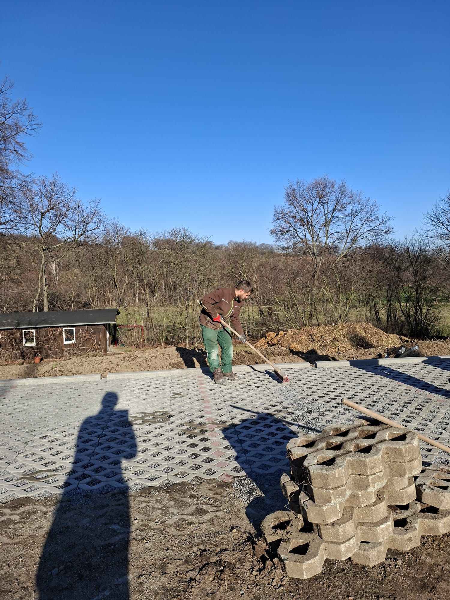 Der Parkplatz ist sozusagen erst mal fertig. Die Sturzsicherung an der Betonkante fehlt noch, der begehbare Weg an der Kopfseite muss nur noch gemacht werden und…. Naja einiges ist noch zu tun.
