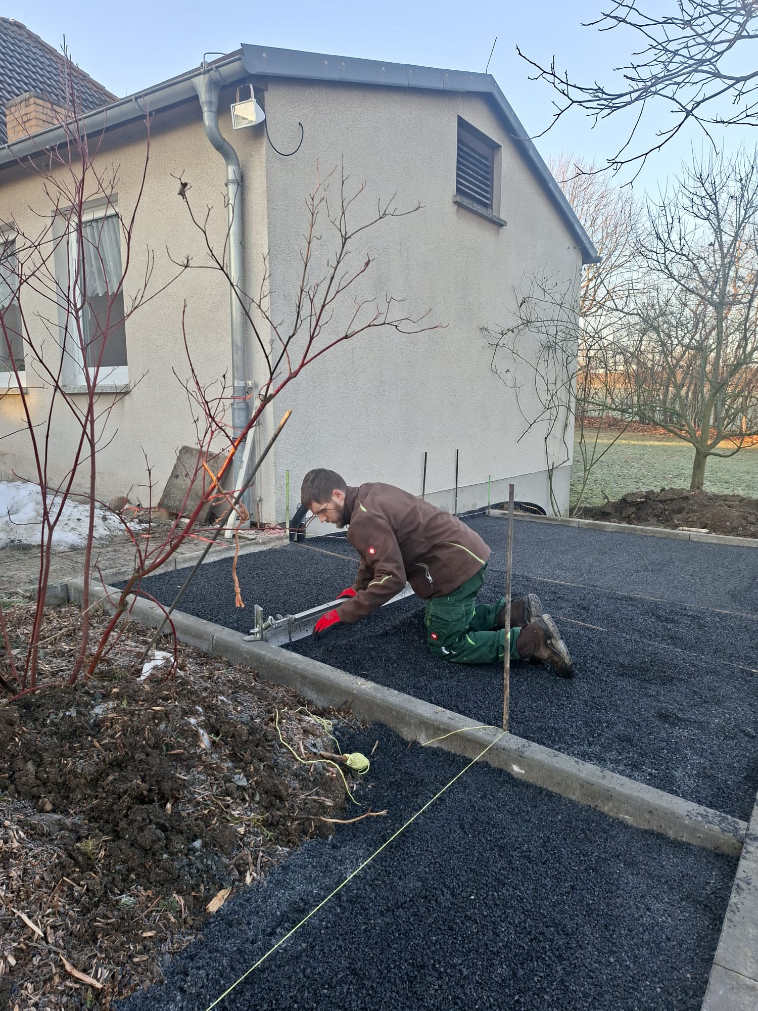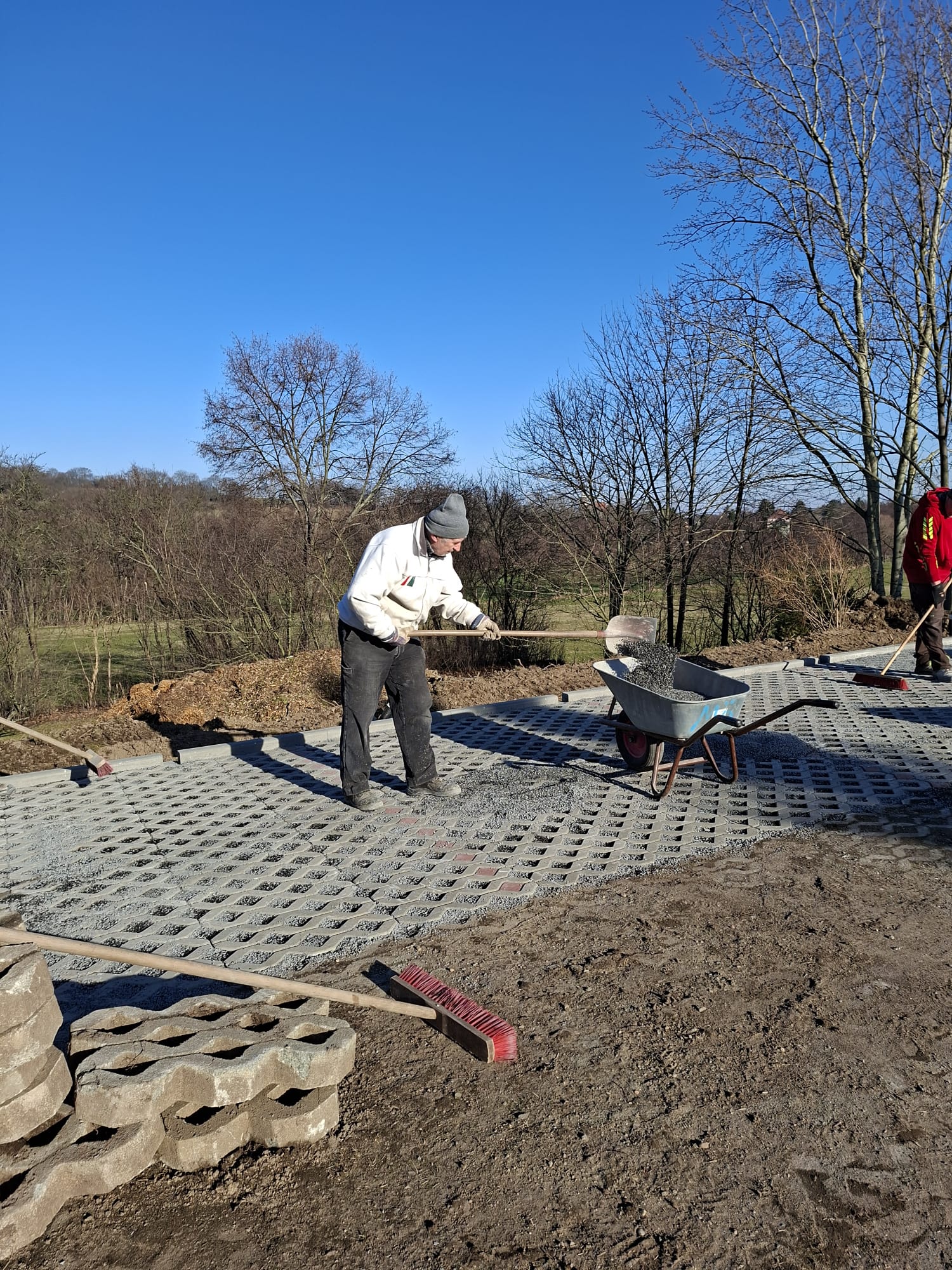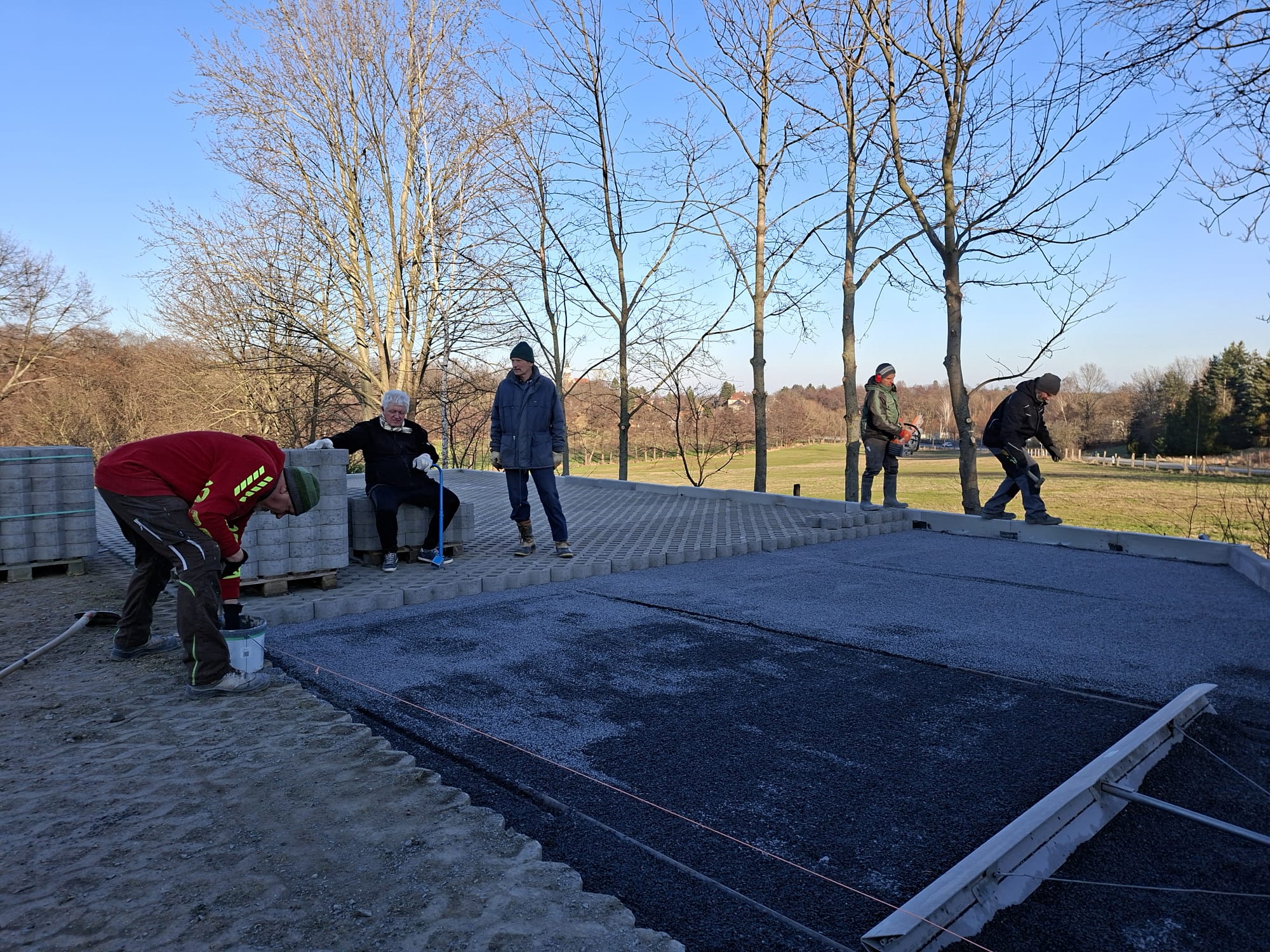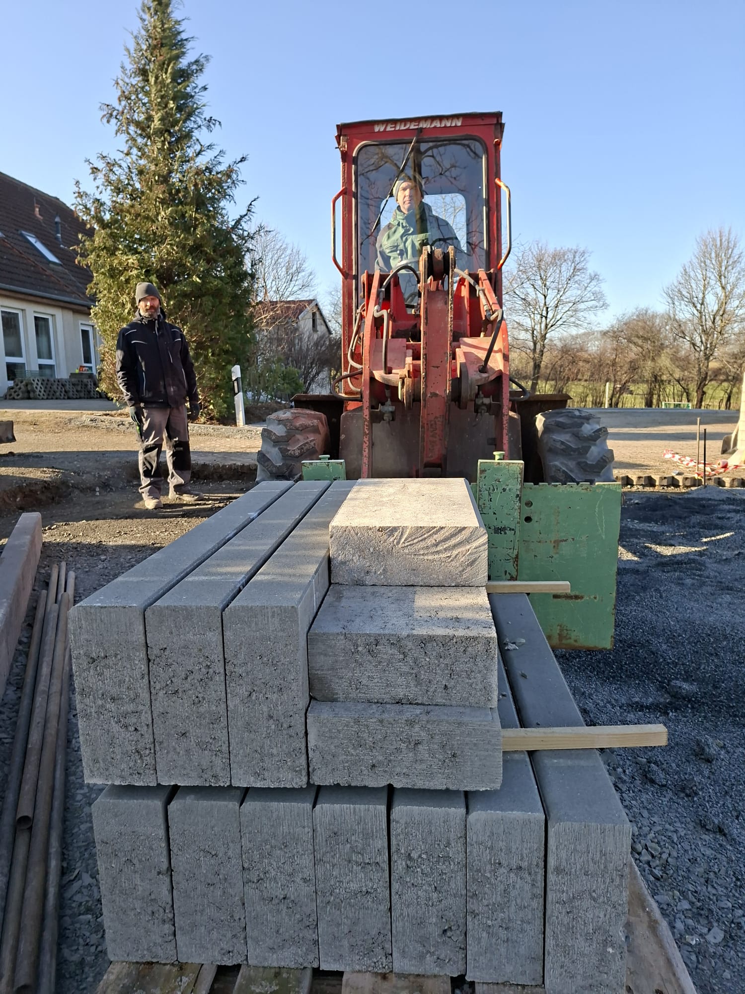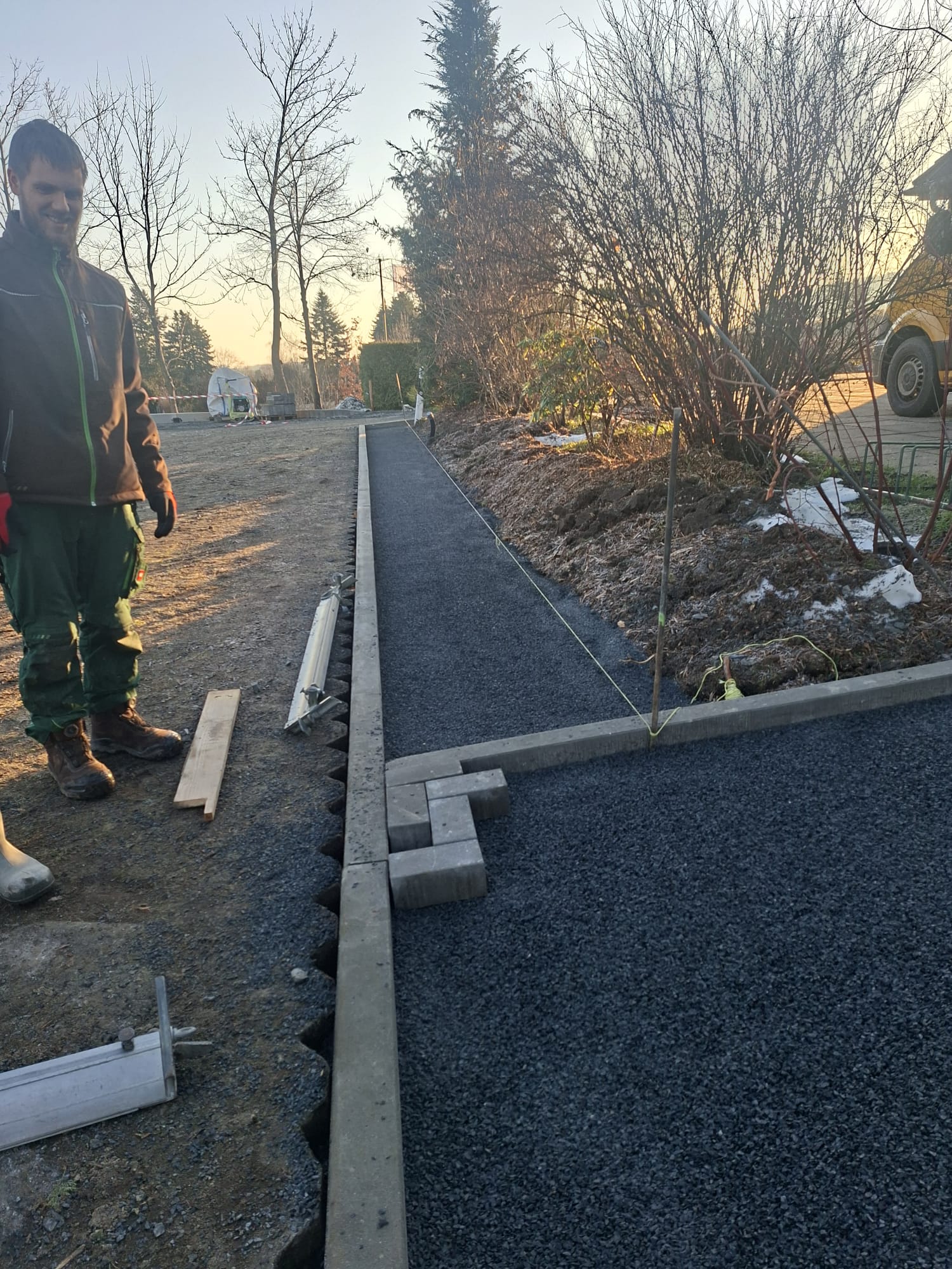 Der Parkplatz ist sozusagen erst mal fertig. Die Sturzsicherung an der Betonkante fehlt noch, der begehbare Weg an der Kopfseite muss nur noch gemacht werden und…. Naja einiges ist noch zu tun.