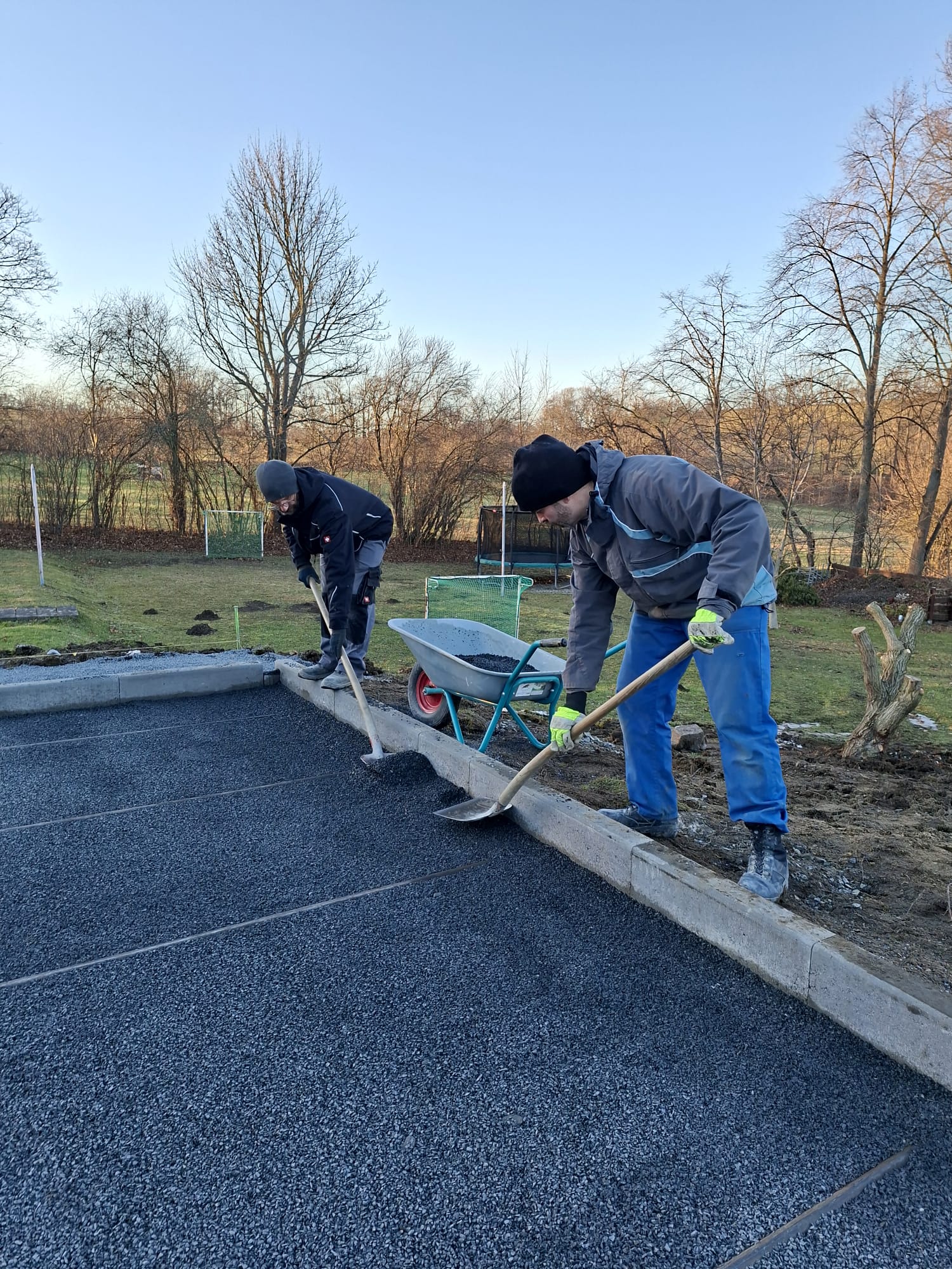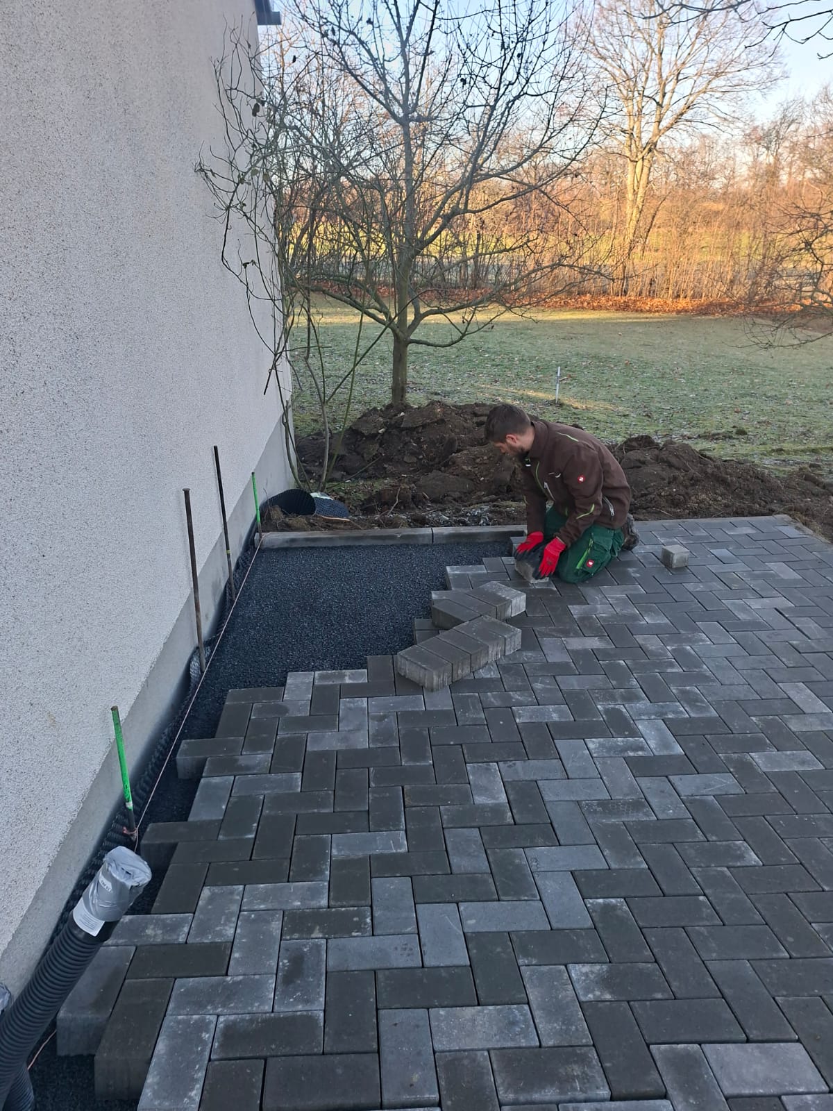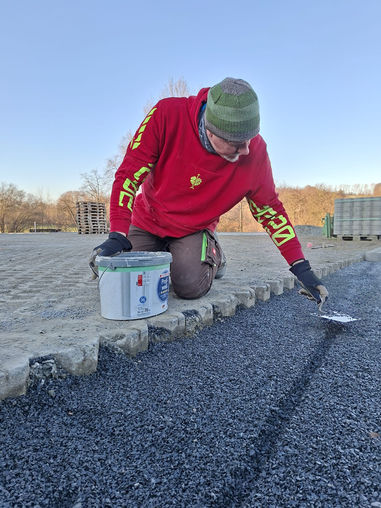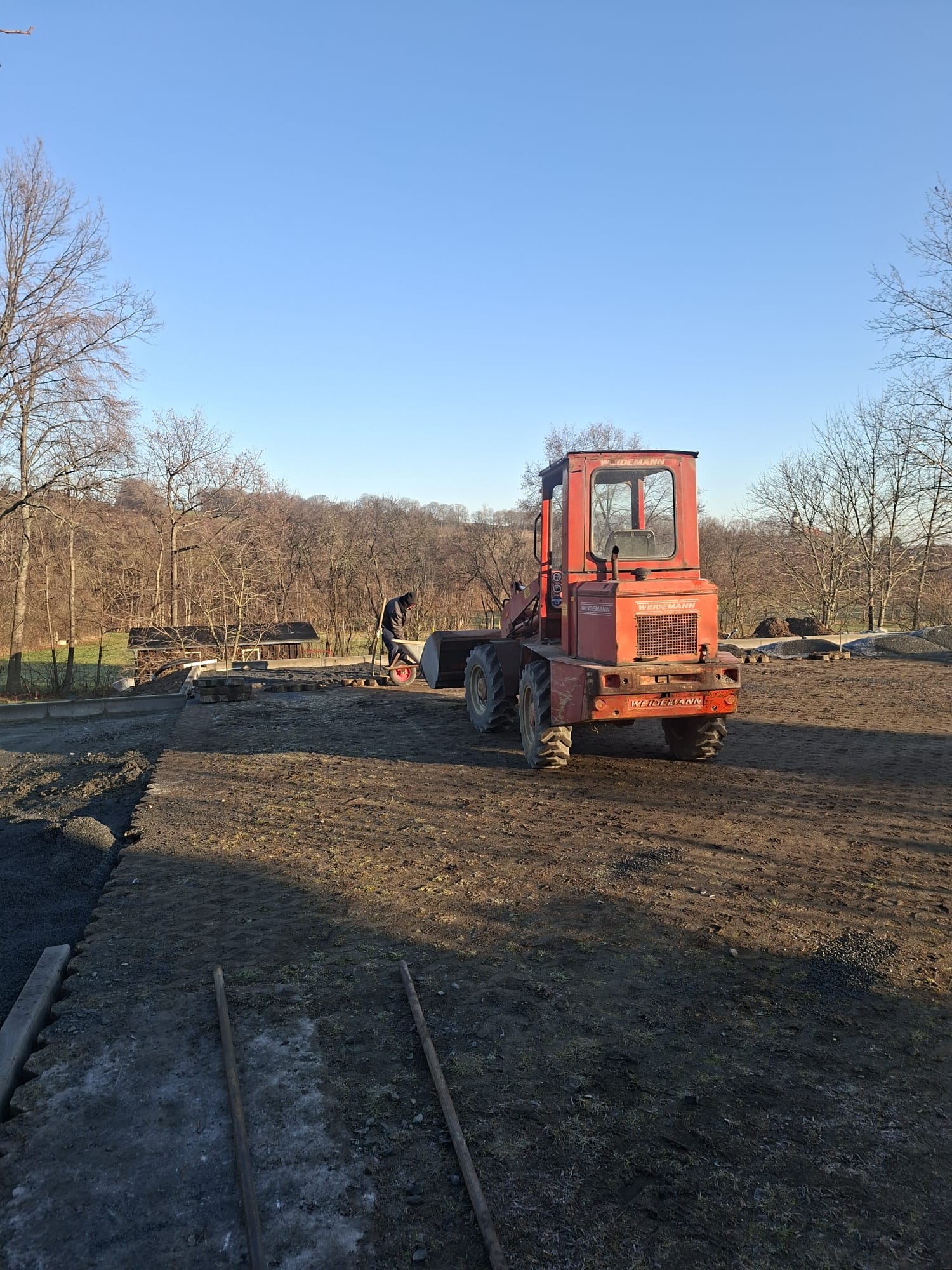 Der Parkplatz ist sozusagen erst mal fertig. Die Sturzsicherung an der Betonkante fehlt noch, der begehbare Weg an der Kopfseite muss nur noch gemacht werden und…. Naja einiges ist noch zu tun.