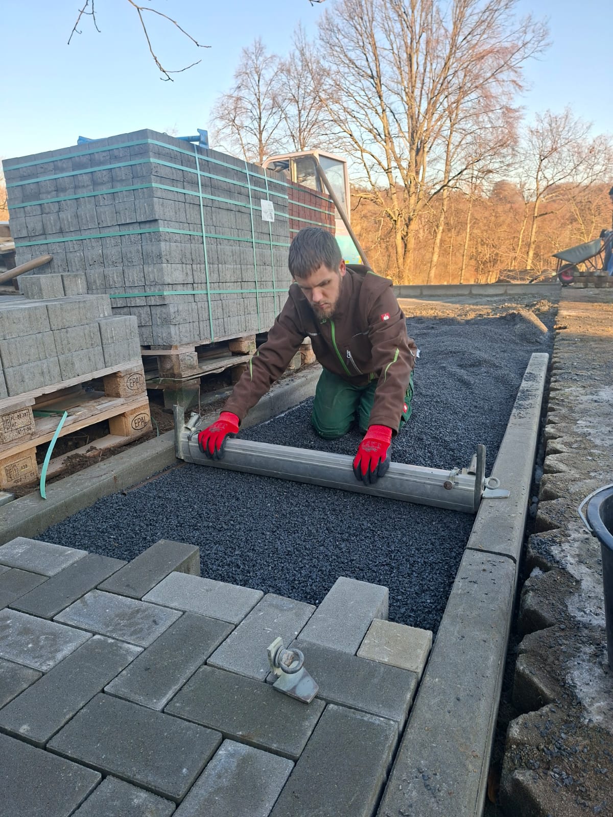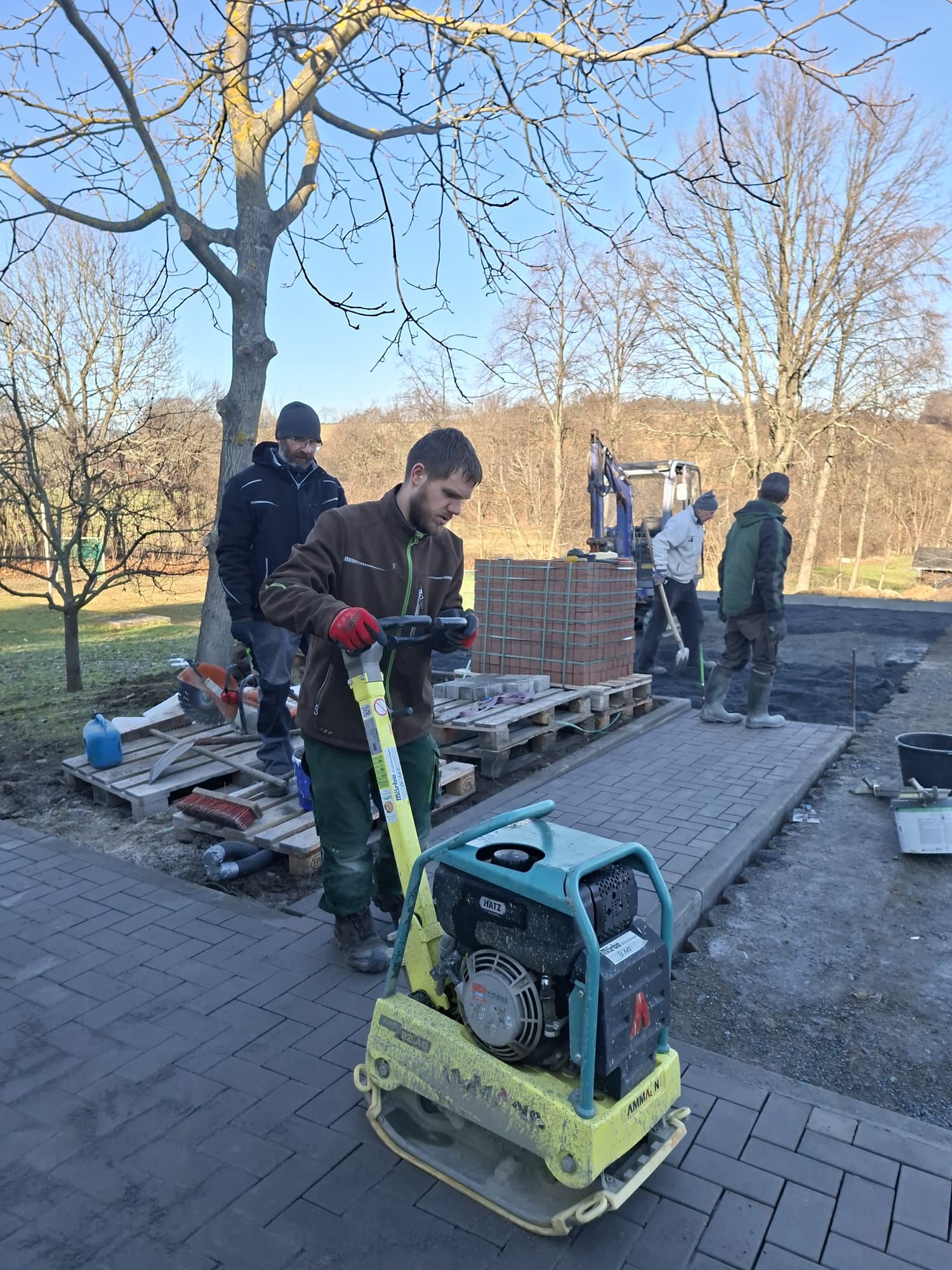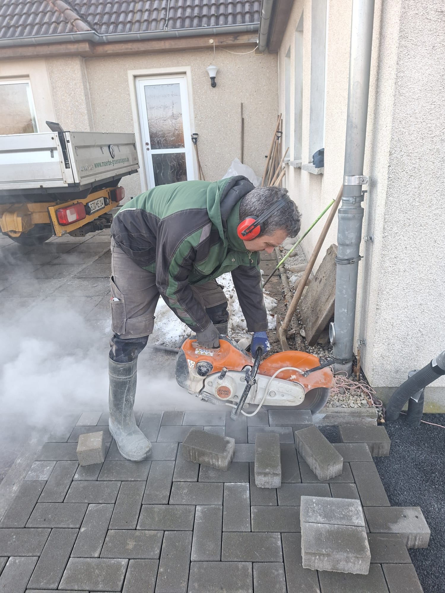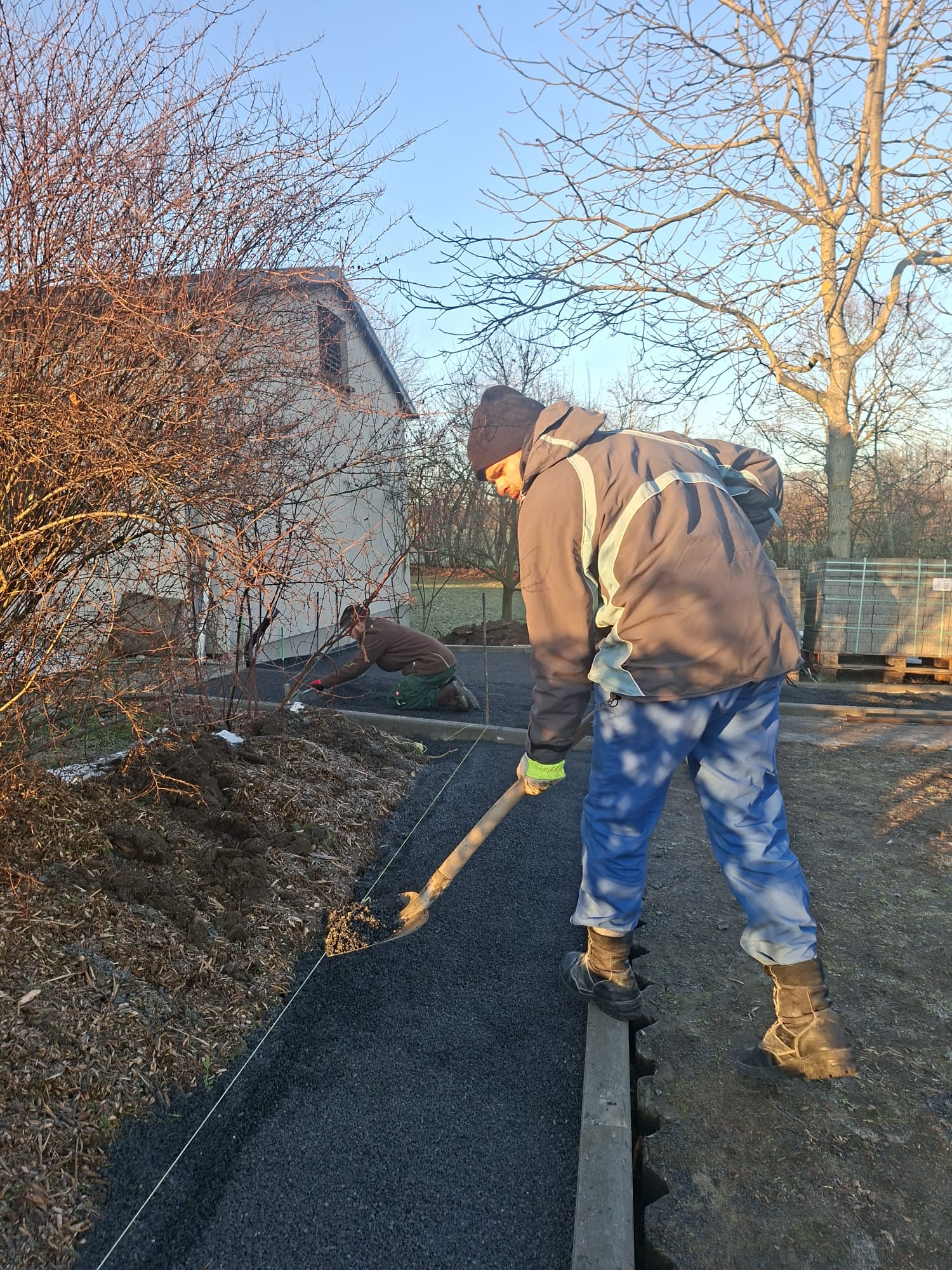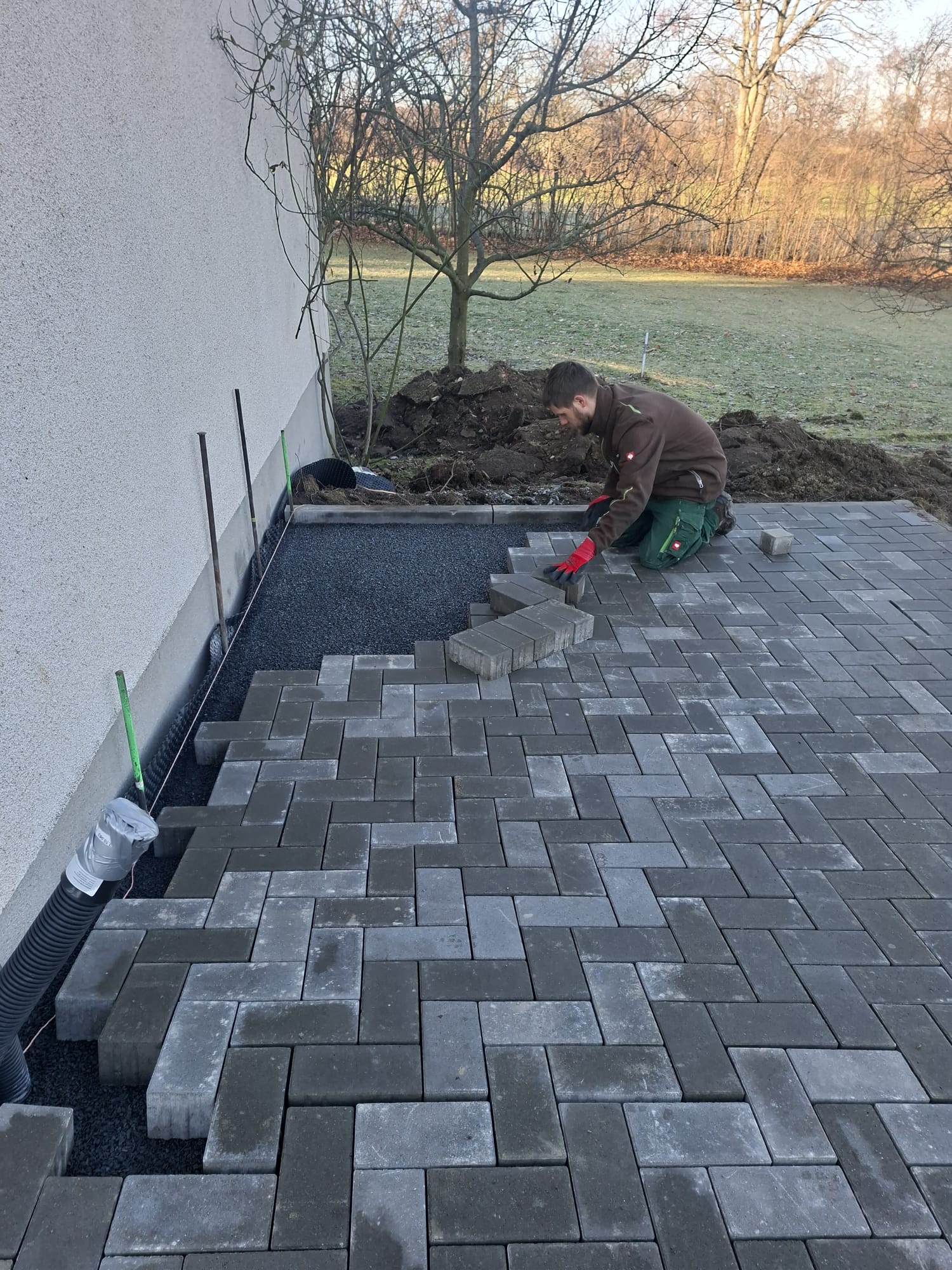Der Parkplatz ist sozusagen erst mal fertig. Die Sturzsicherung an der Betonkante fehlt noch, der begehbare Weg an der Kopfseite muss nur noch gemacht werden und…. Naja einiges ist noch zu tun.
