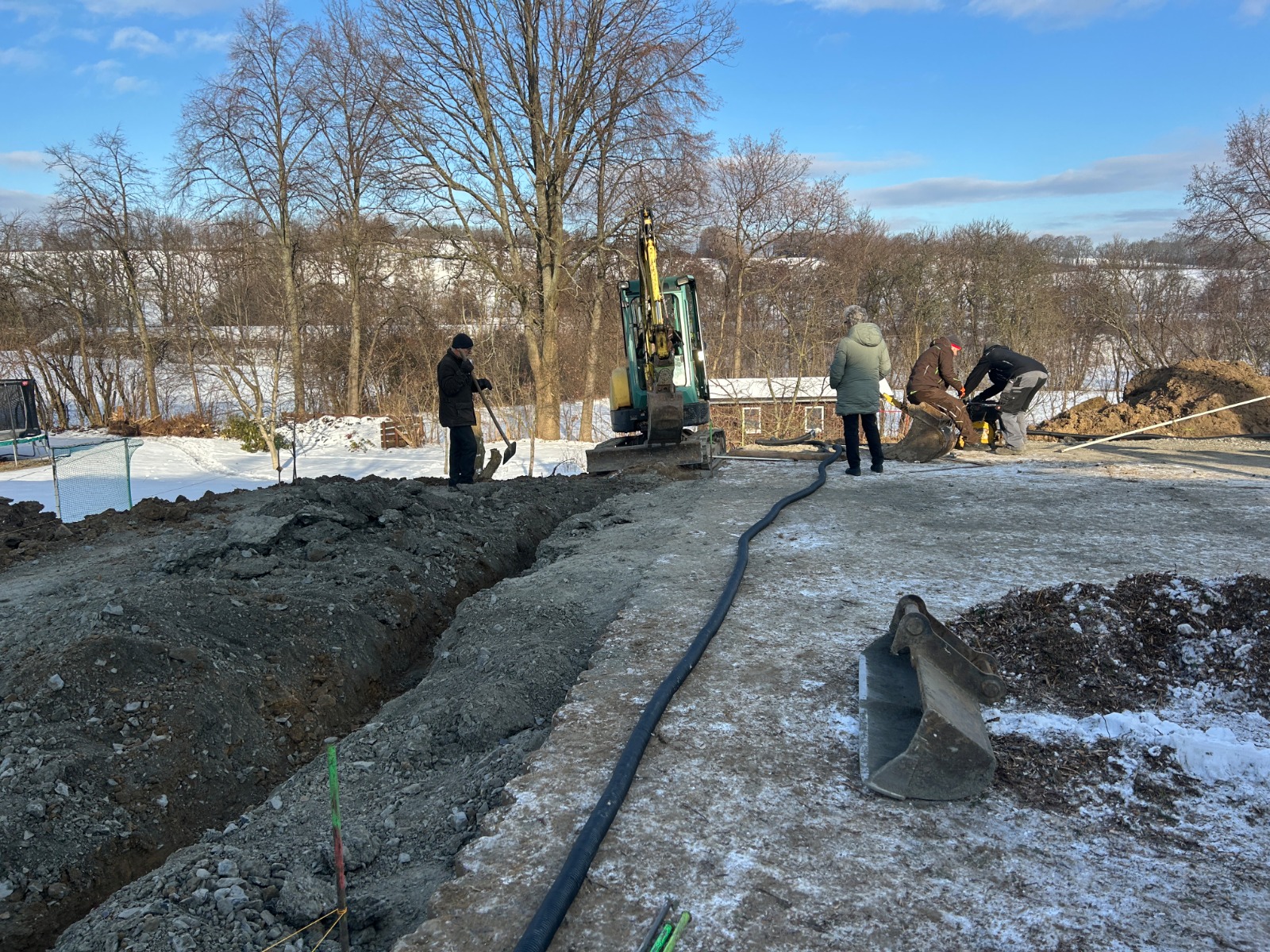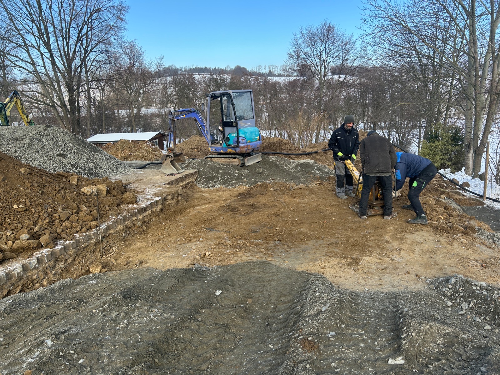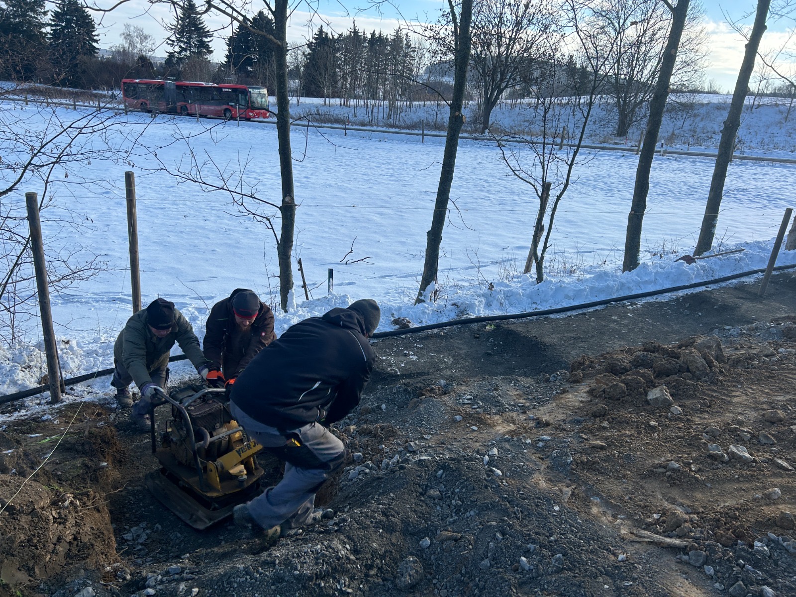 Das klingt nach einem gebrauchten Tag. Dennoch ging es vorwärts. Weiteres Mineralgemisch konnte geliefert werden und auch Kabelschächte für Elektrik wurden verlegt.