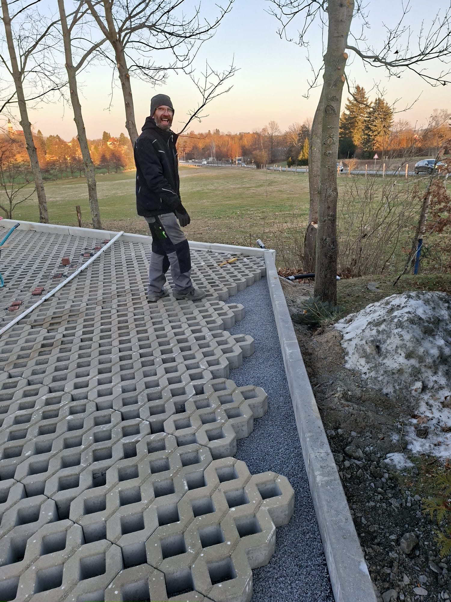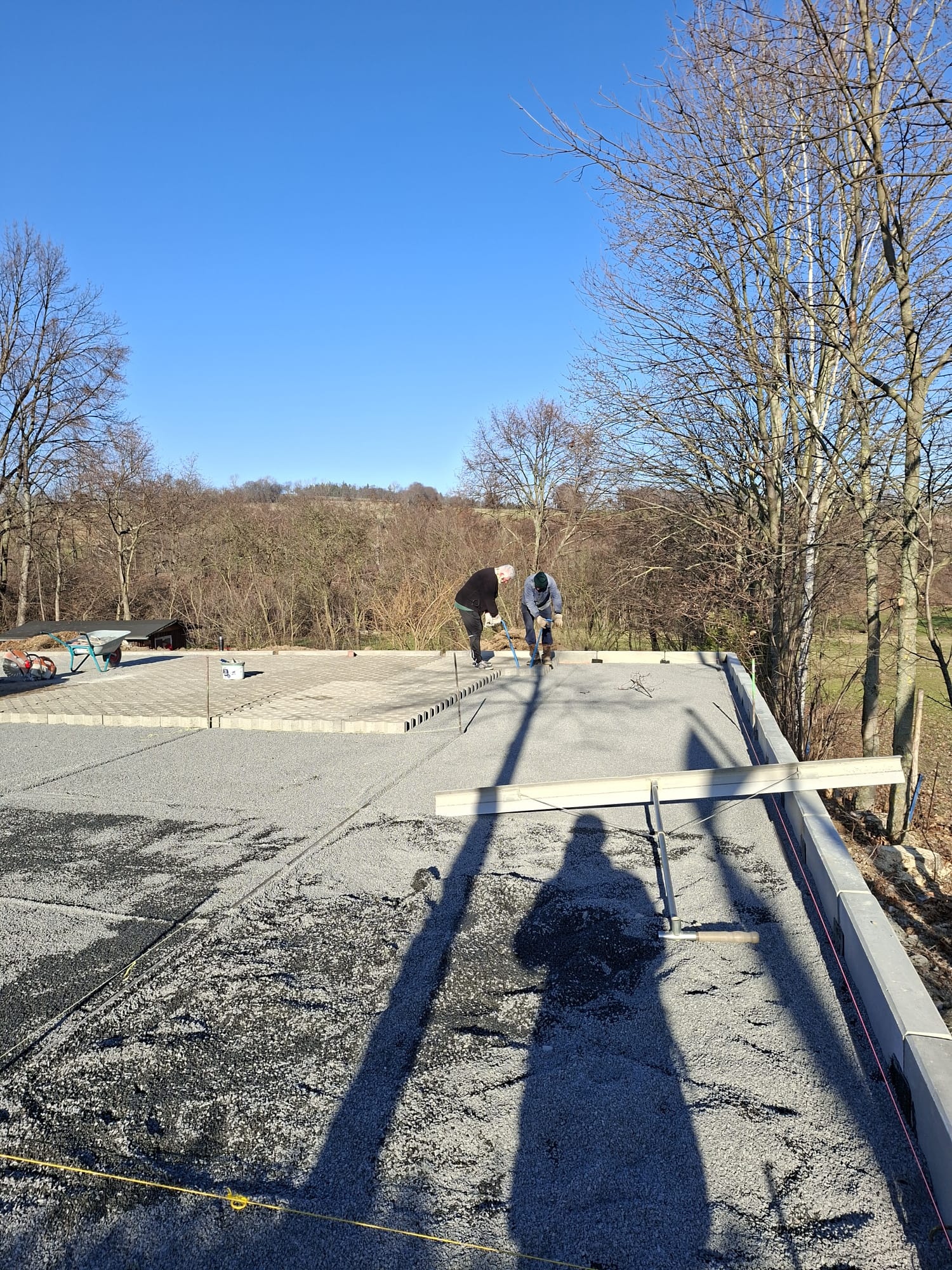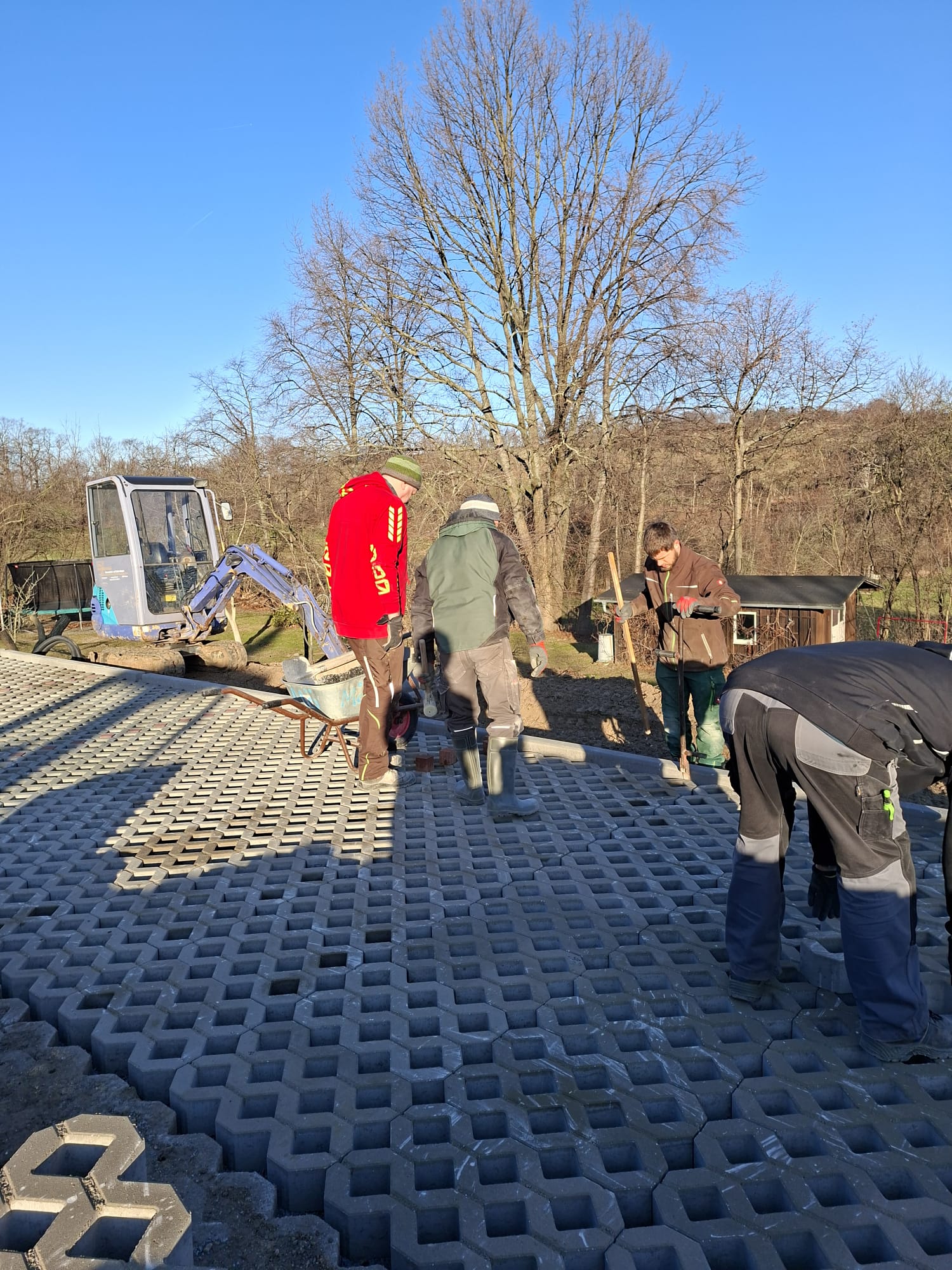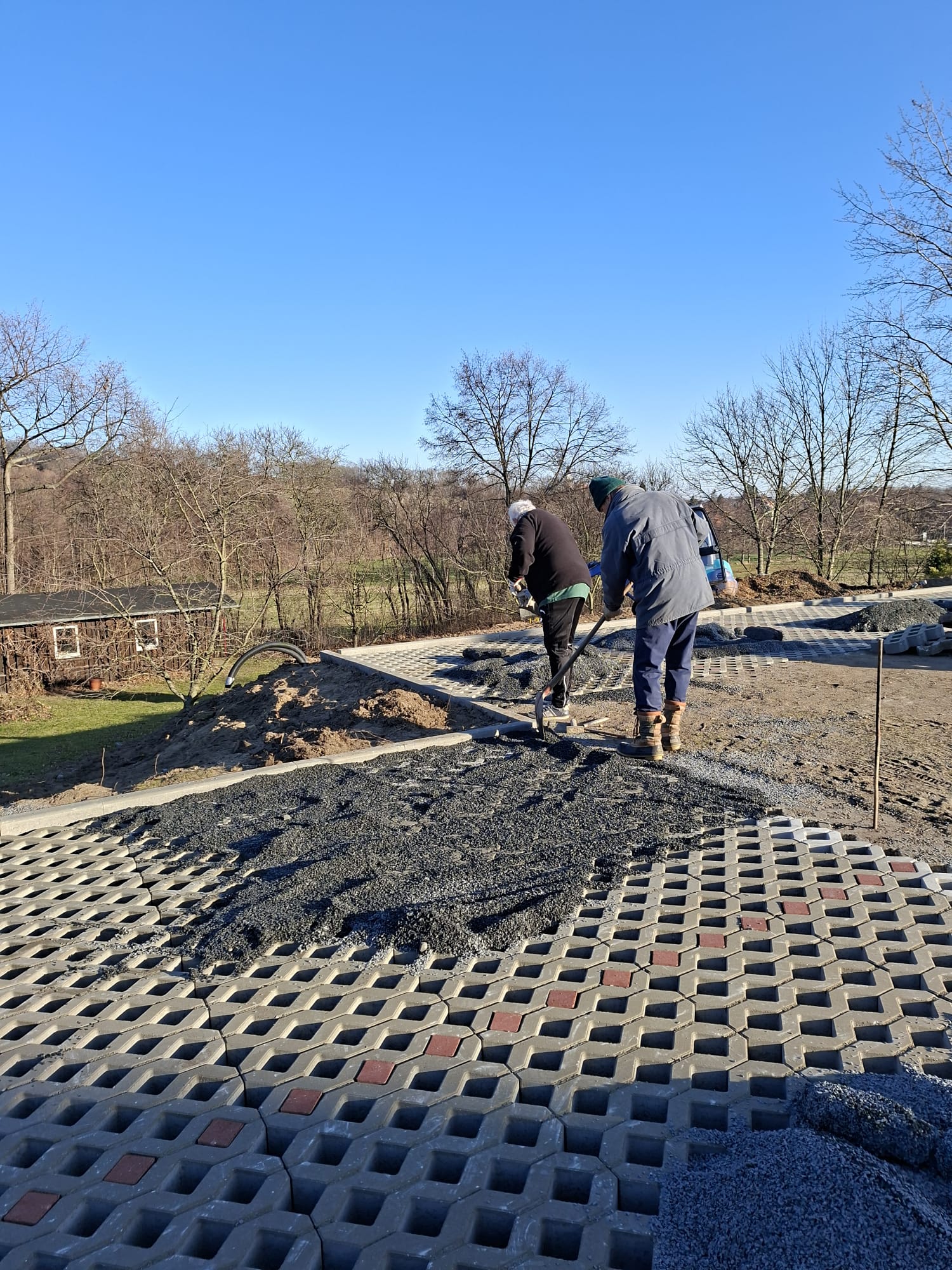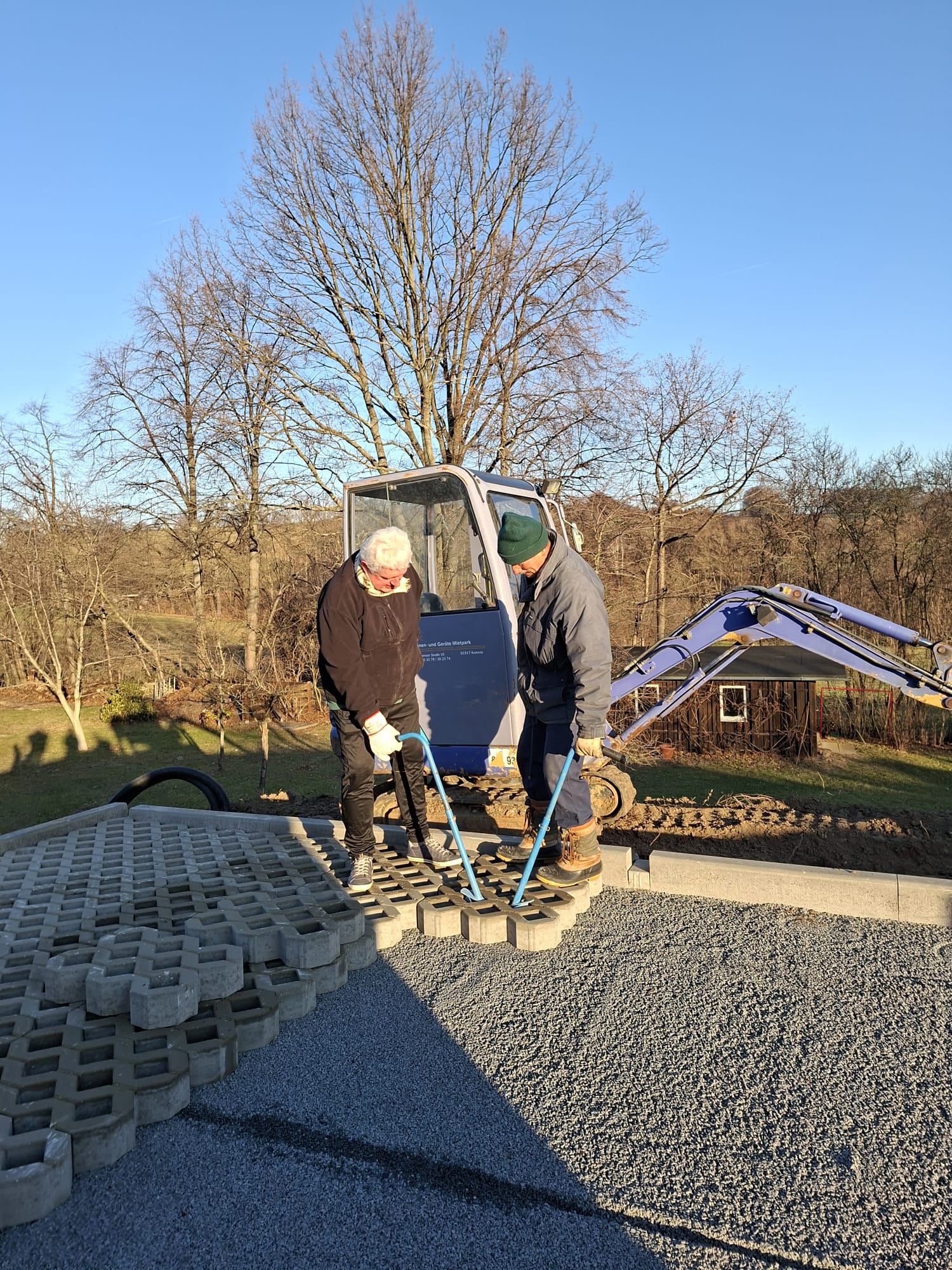 Der Parkplatz ist sozusagen erst mal fertig. Die Sturzsicherung an der Betonkante fehlt noch, der begehbare Weg an der Kopfseite muss nur noch gemacht werden und…. Naja einiges ist noch zu tun.