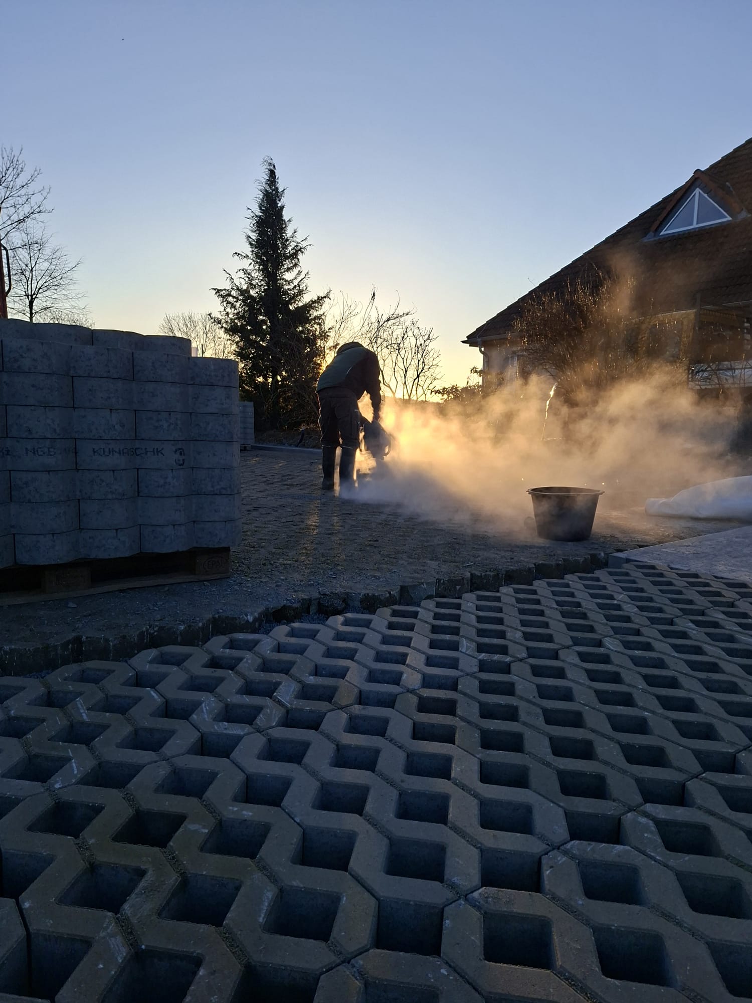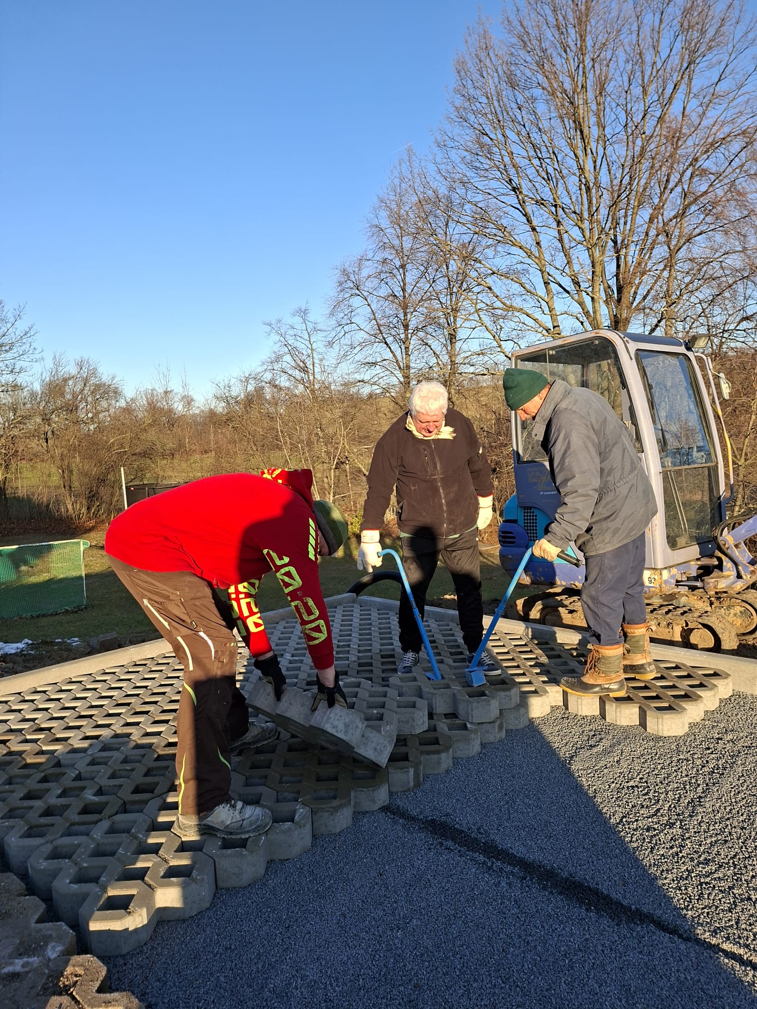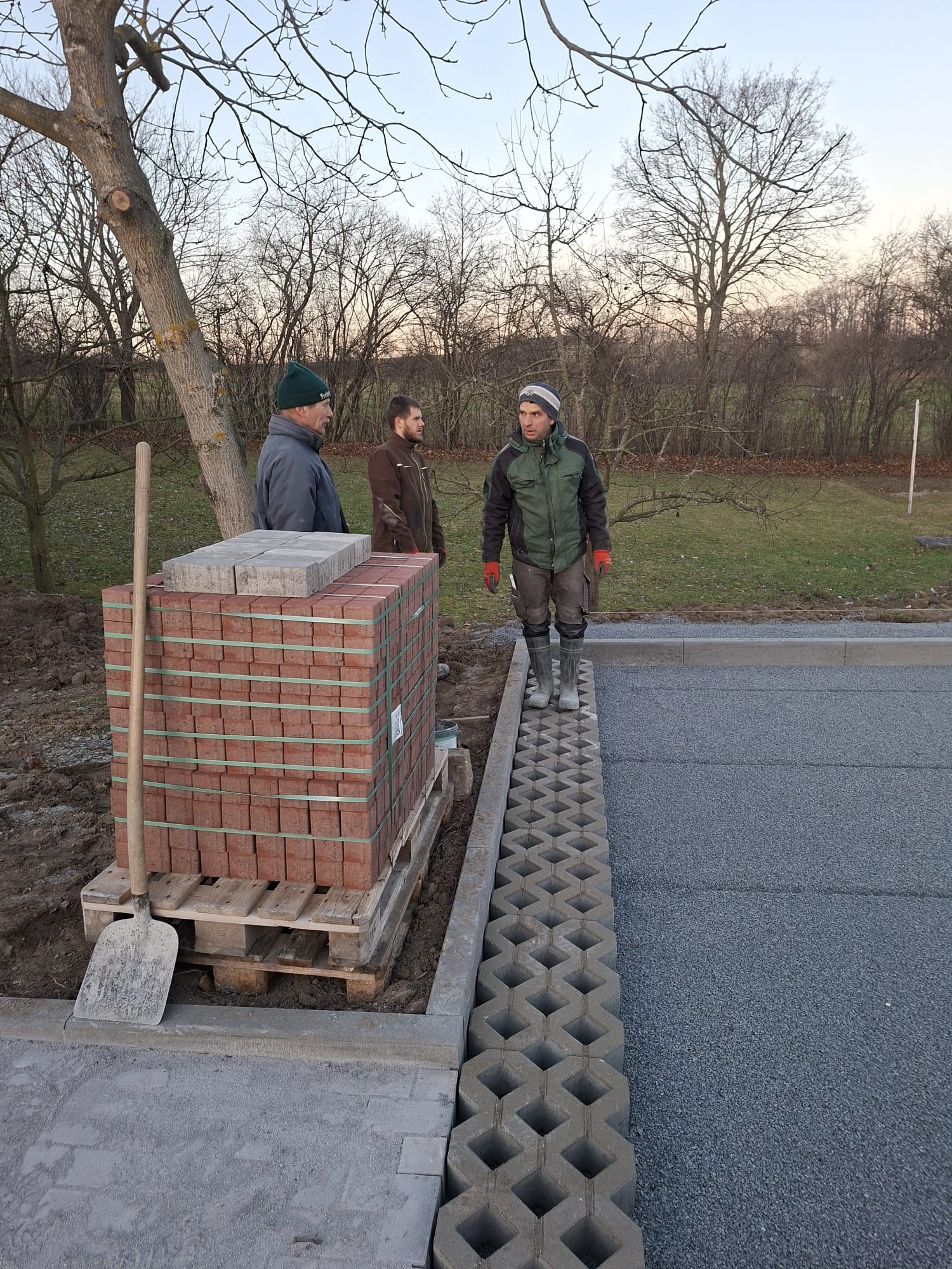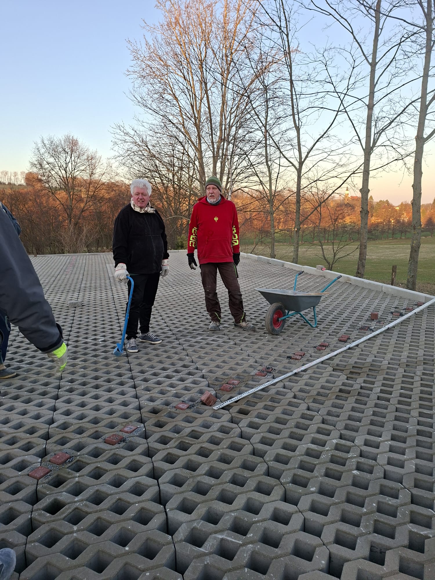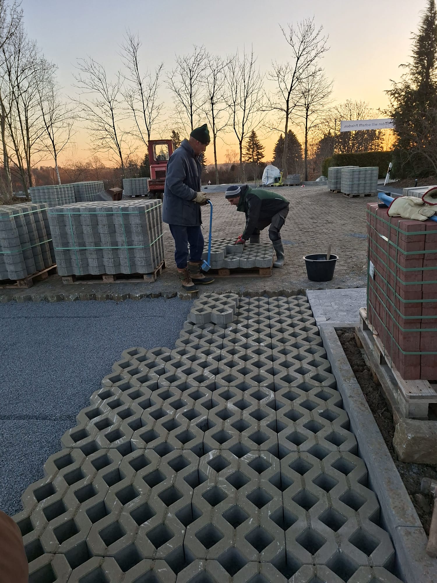 Der Parkplatz ist sozusagen erst mal fertig. Die Sturzsicherung an der Betonkante fehlt noch, der begehbare Weg an der Kopfseite muss nur noch gemacht werden und…. Naja einiges ist noch zu tun.