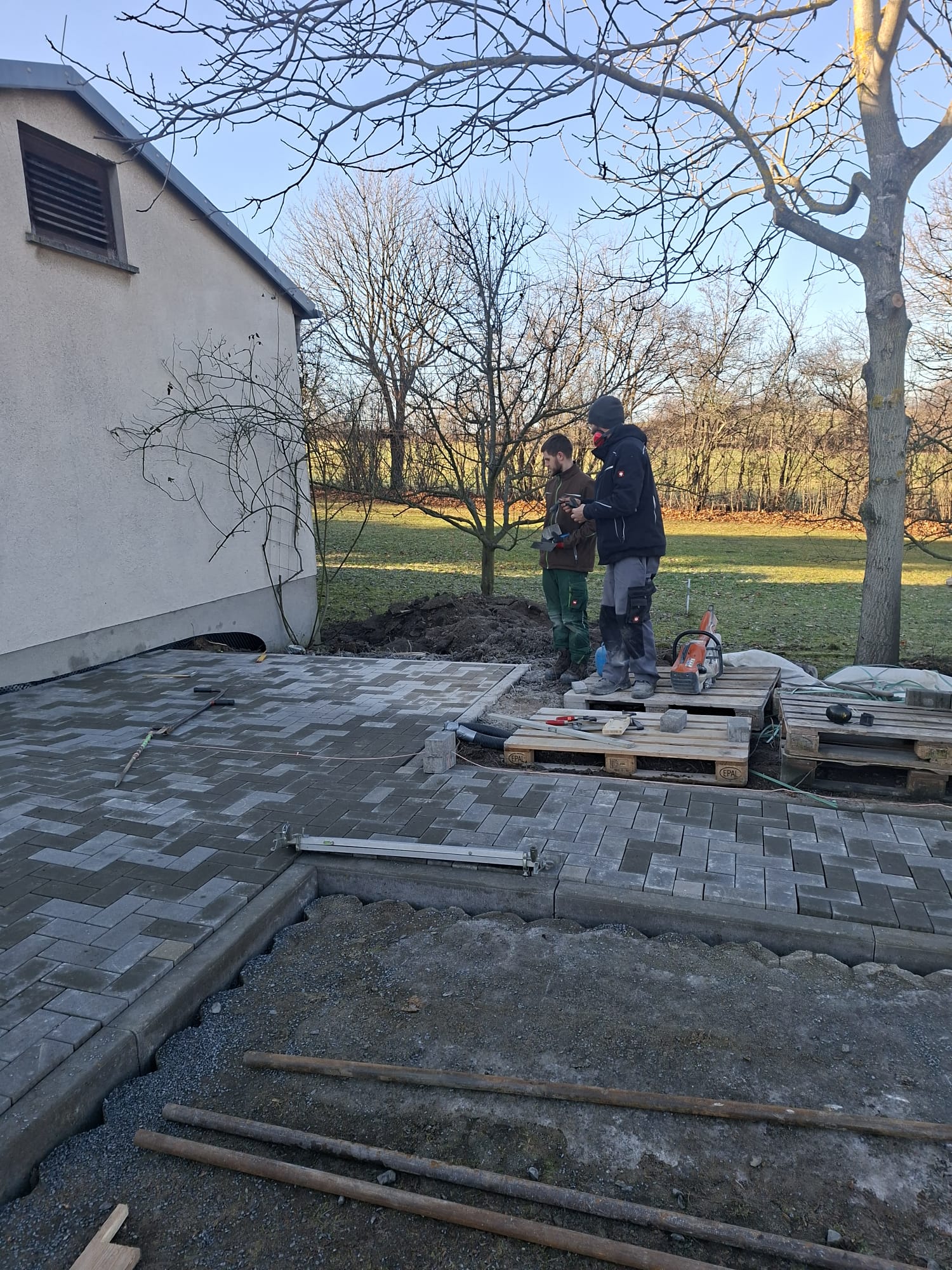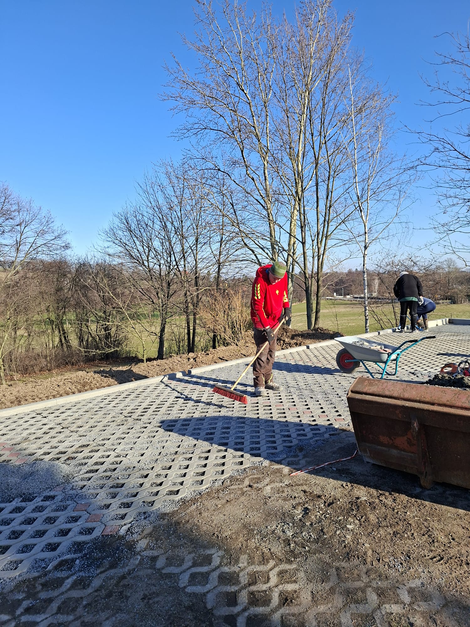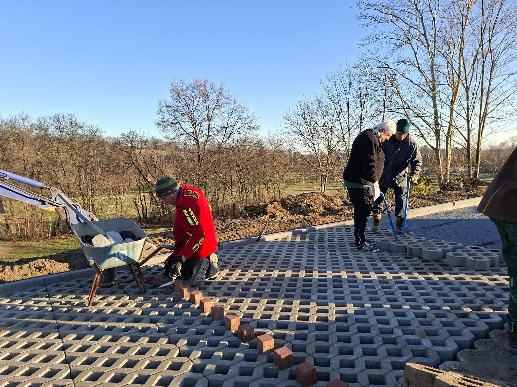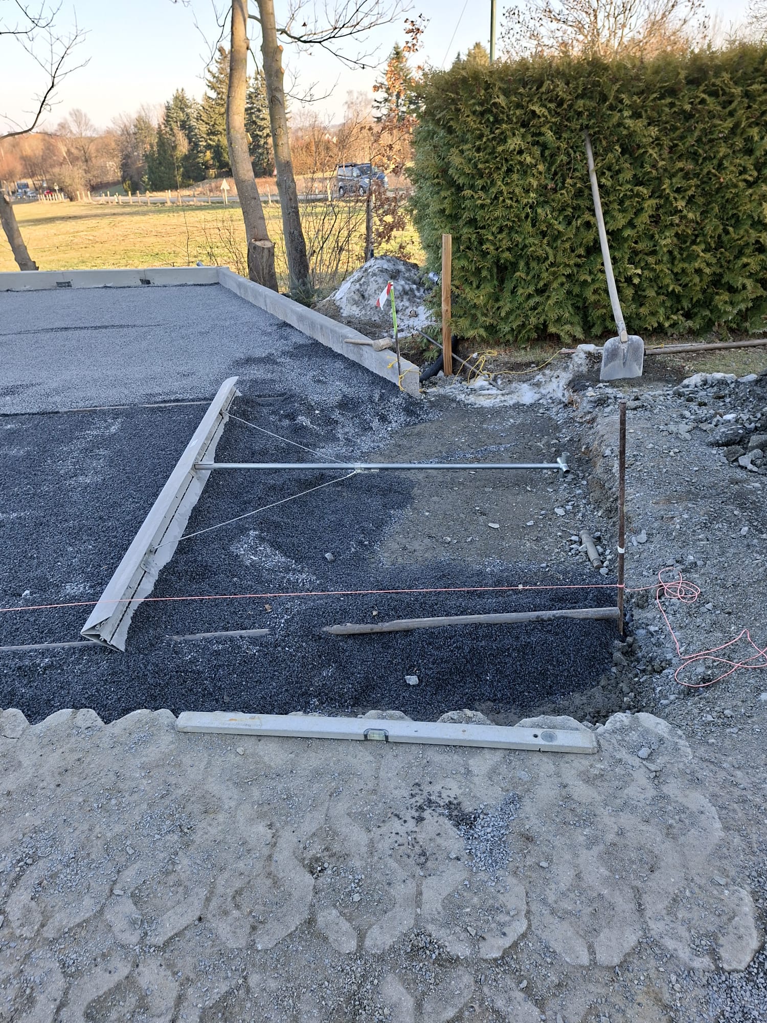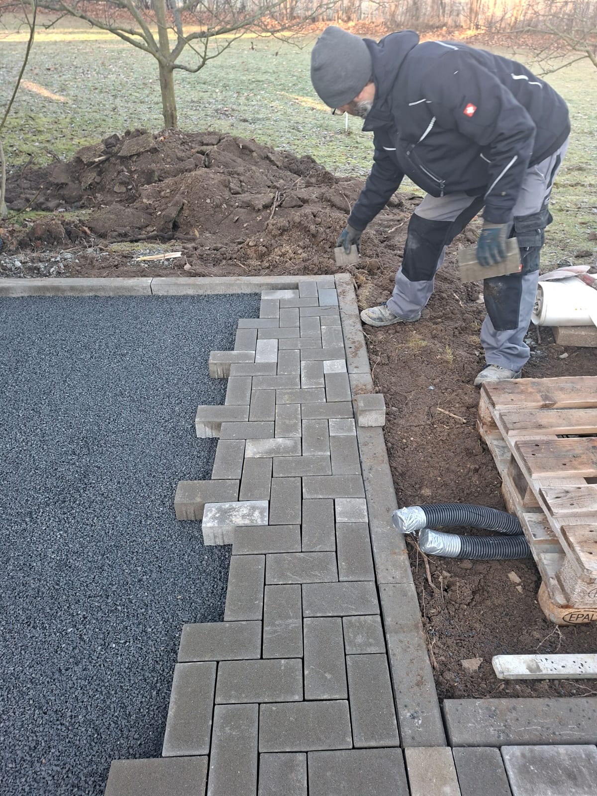 Der Parkplatz ist sozusagen erst mal fertig. Die Sturzsicherung an der Betonkante fehlt noch, der begehbare Weg an der Kopfseite muss nur noch gemacht werden und…. Naja einiges ist noch zu tun.