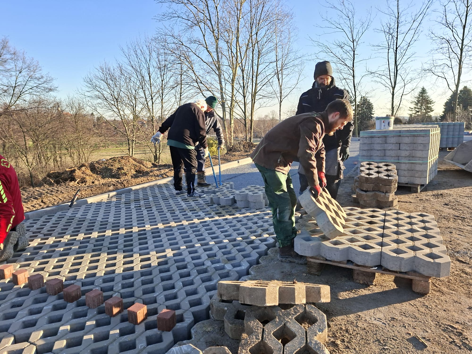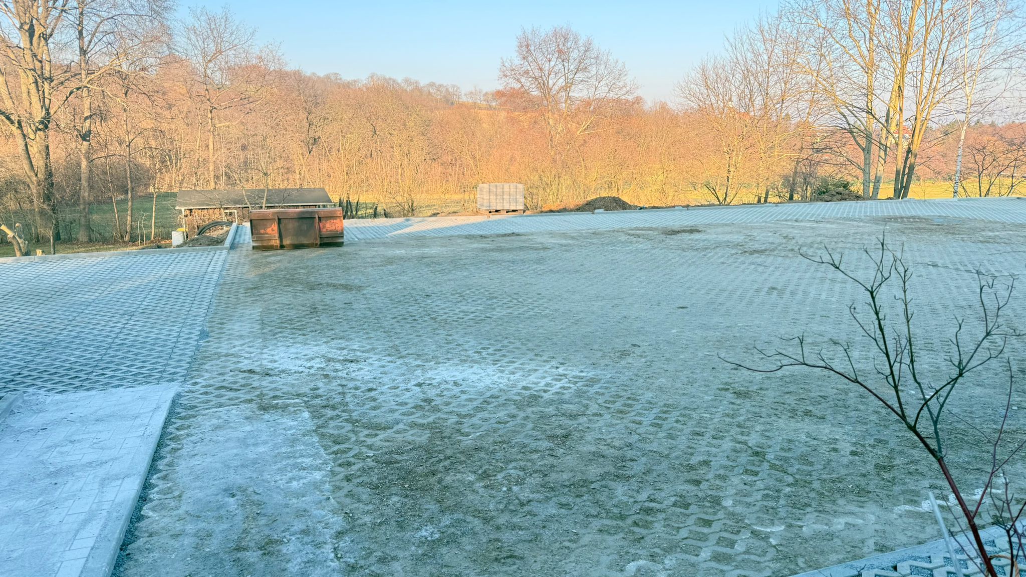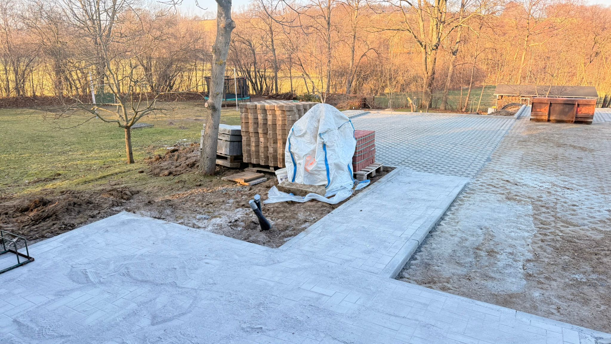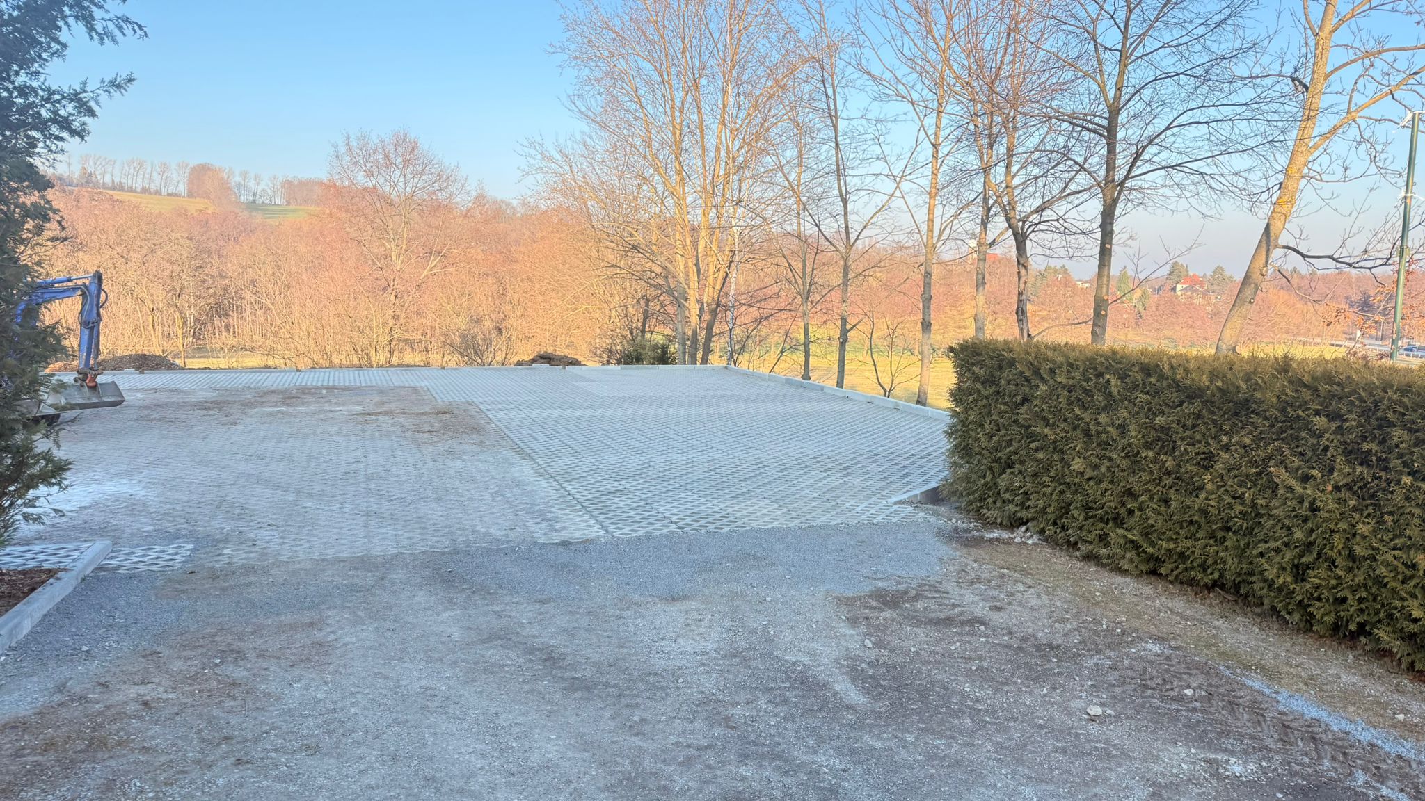 Der Parkplatz ist sozusagen erst mal fertig. Die Sturzsicherung an der Betonkante fehlt noch, der begehbare Weg an der Kopfseite muss nur noch gemacht werden und…. Naja einiges ist noch zu tun.